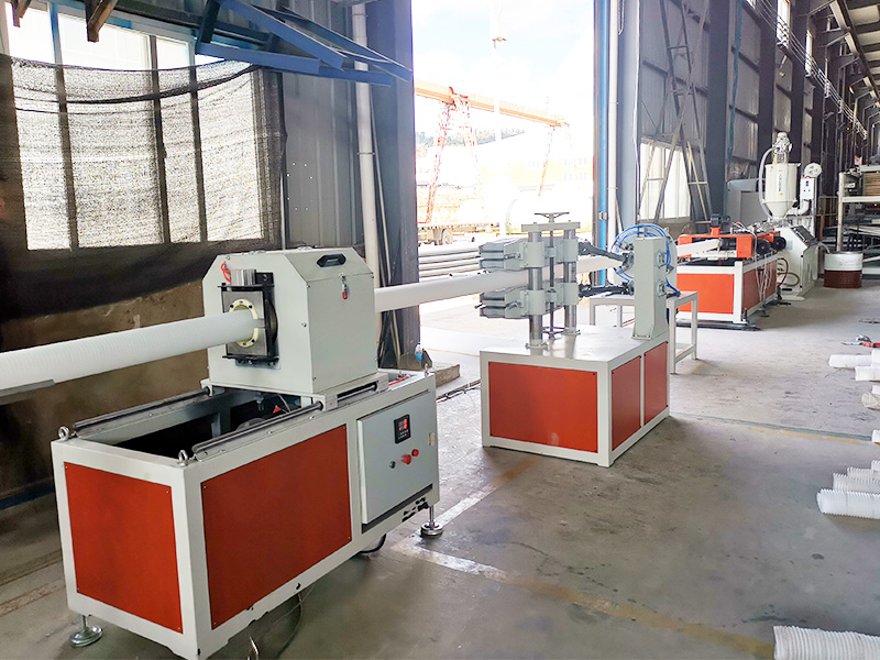 我司制造的口徑為200-600的HDPE/PVC雙壁波紋管擠出生產(chǎn)線,具有產(chǎn)量高、擠出穩(wěn)定和自動(dòng)化程高的優(yōu)點(diǎn)。擠出機(jī)可根據(jù)用戶原料情況特殊設(shè)計(jì),HDPE采用新型高效單螺桿擠出機(jī)。模具及輔機(jī):成型機(jī)及機(jī)頭精確度高,模塊互換性好,模塊冷卻方式有水冷和風(fēng)冷兩種,保成型管材的項(xiàng)性能指標(biāo),整條生產(chǎn)線具有很高的自控功能。